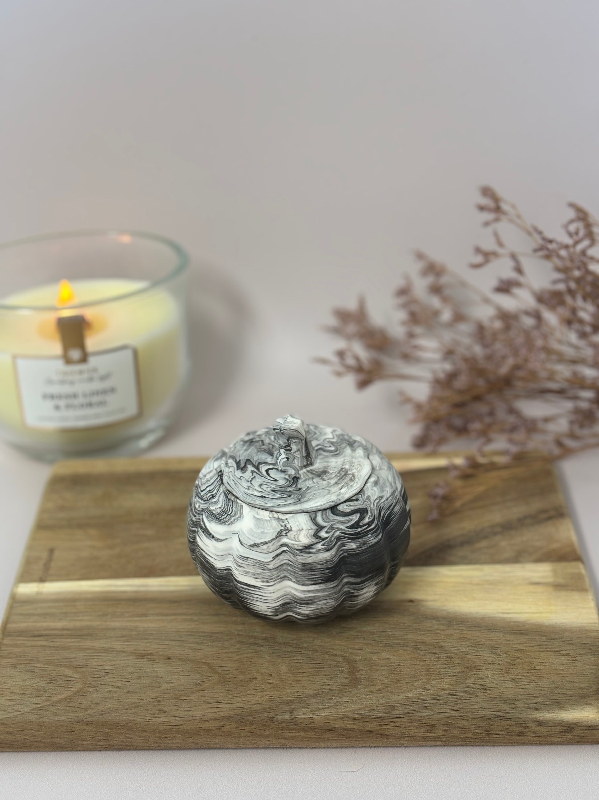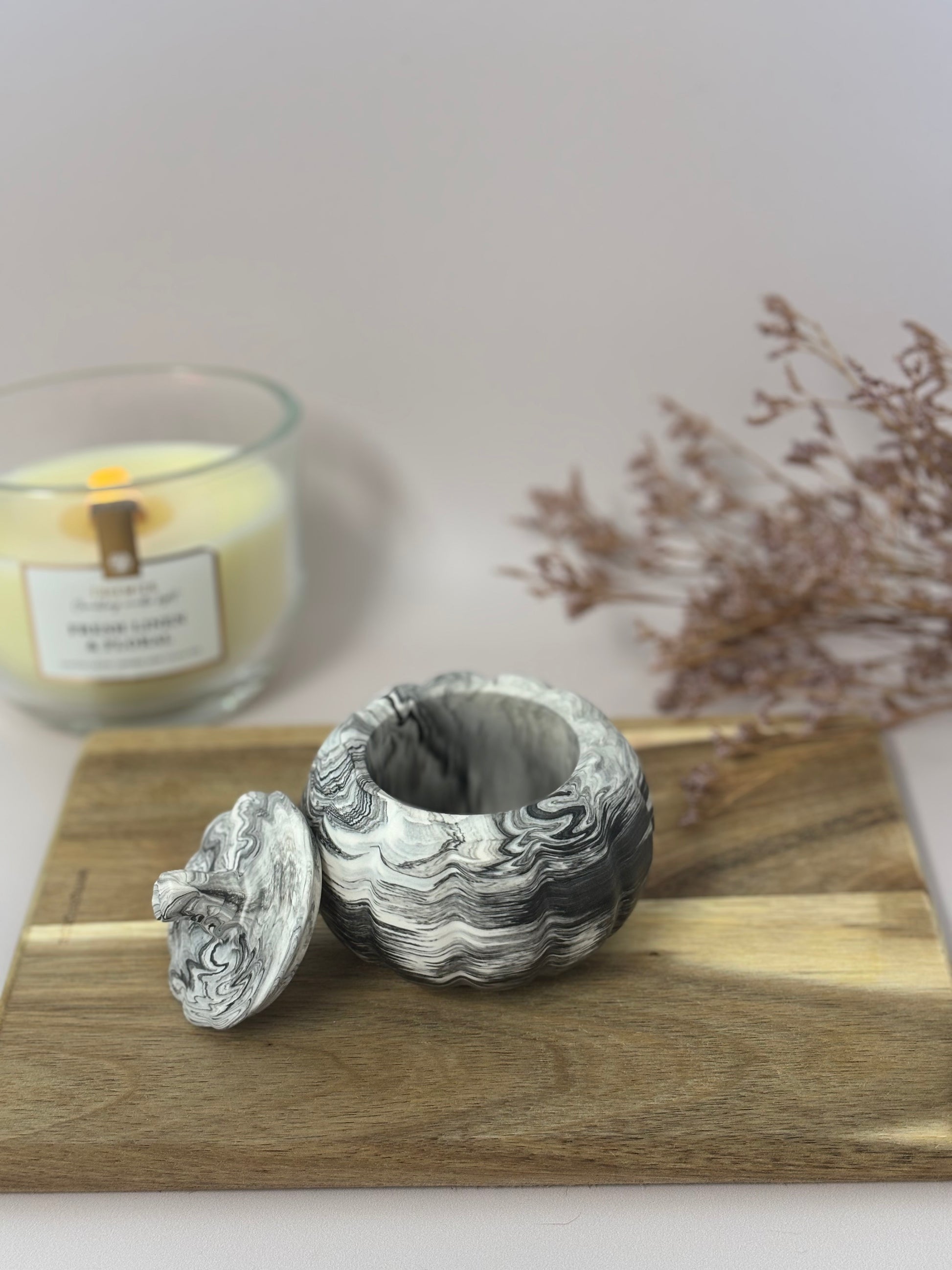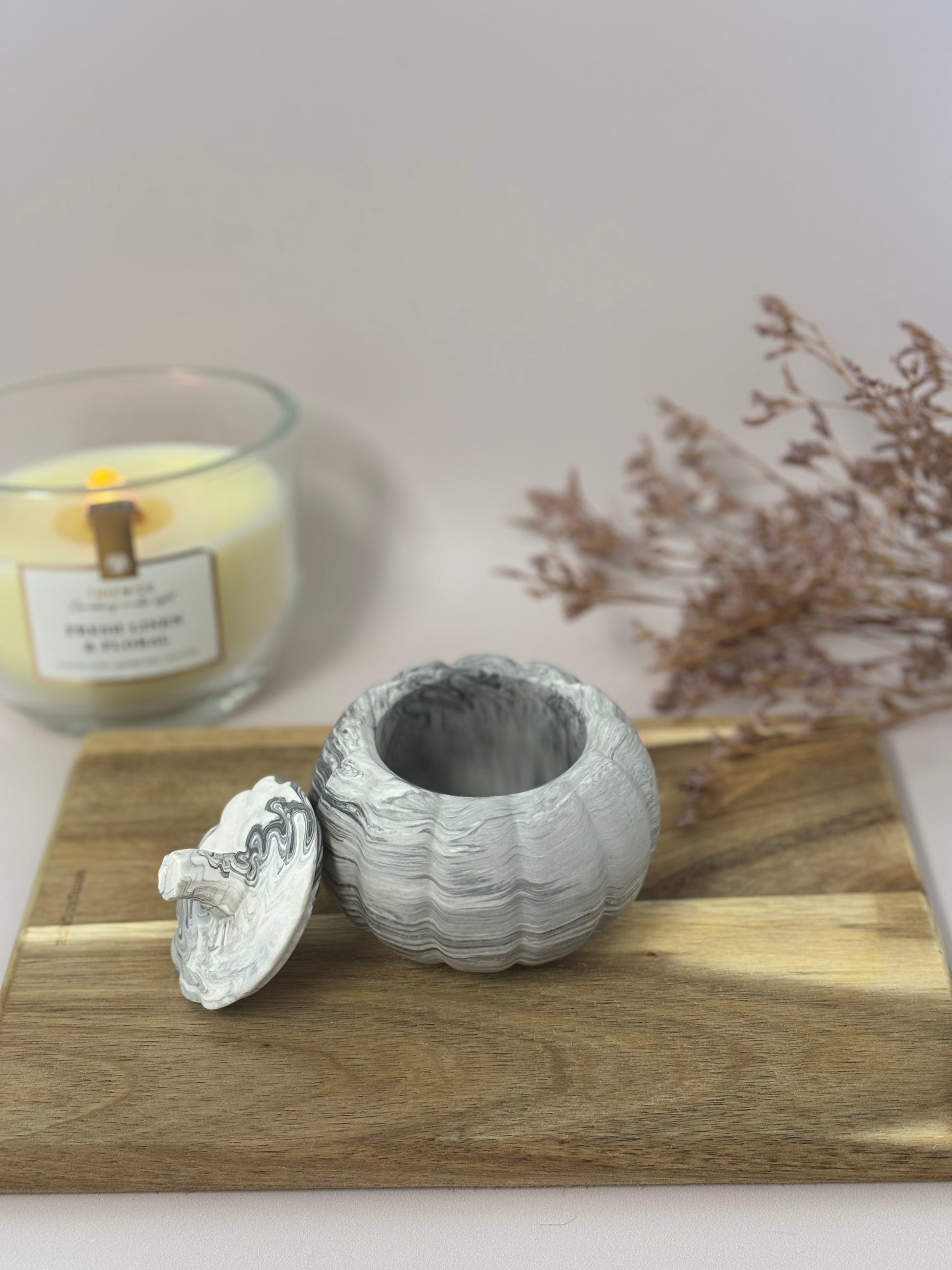 Véritable clin d’œil à l’automne, la boîte Clémentine en forme de citrouille allie originalité et praticité. Son chapeau amovible permet d’y ranger vos petits trésors du quotidien : bijoux, clés, barrettes ou encore une bougie chauffe-plat. Parfaite pour décorer une table, une étagère ou un buffet, elle apporte une touche chaleureuse et ludique à votre intérieur.