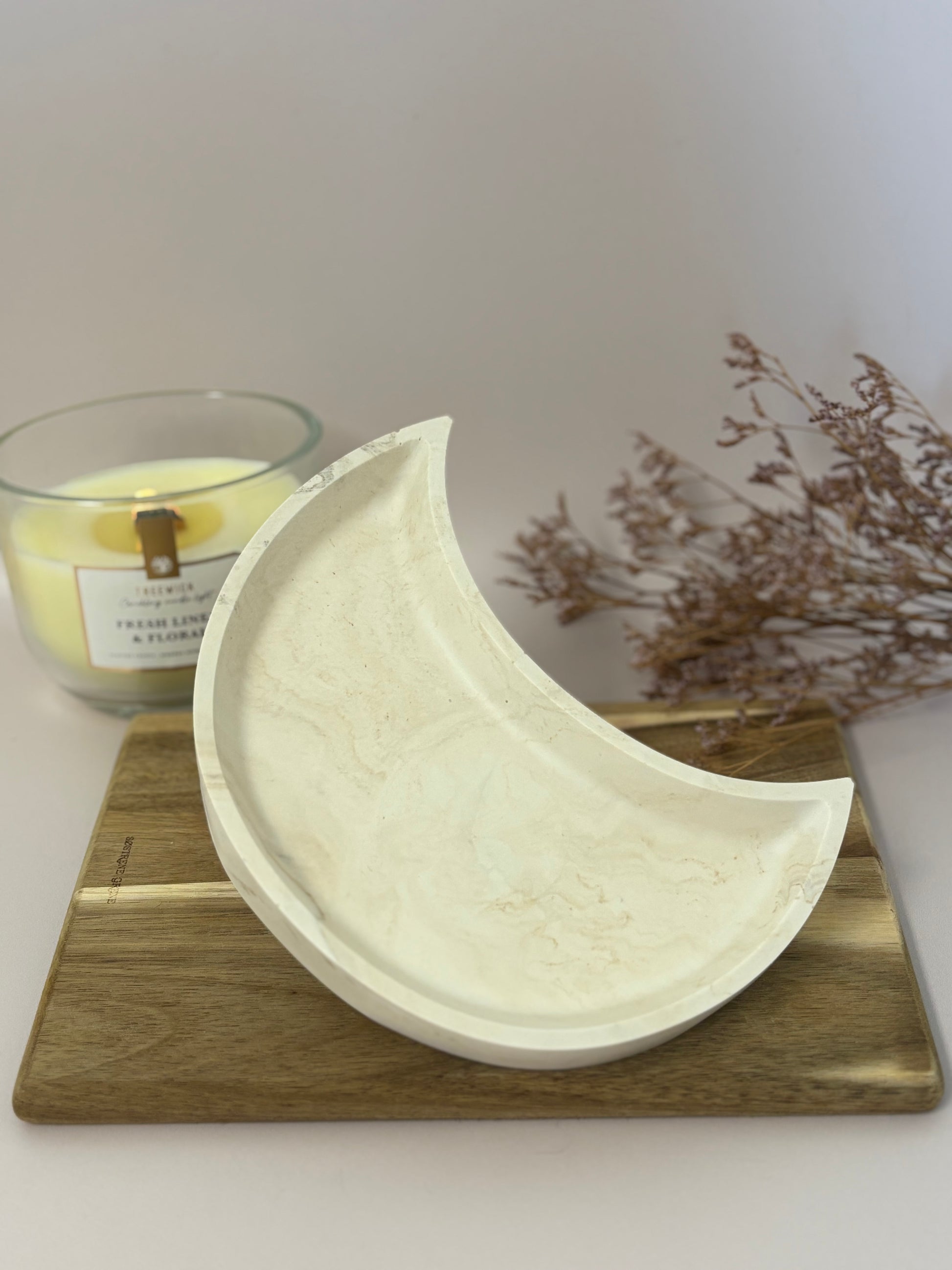 Mystérieux et raffiné, le plateau Luna en forme de lune est une invitation au rêve. Pratique et décoratif, il se prête à de multiples usages : vide-poche pour vos clés et bijoux, support pour une bougie ou élément décoratif à lui seul. Son design unique fait de lui un incontournable pour apporter une touche céleste et automnale à votre décoration.