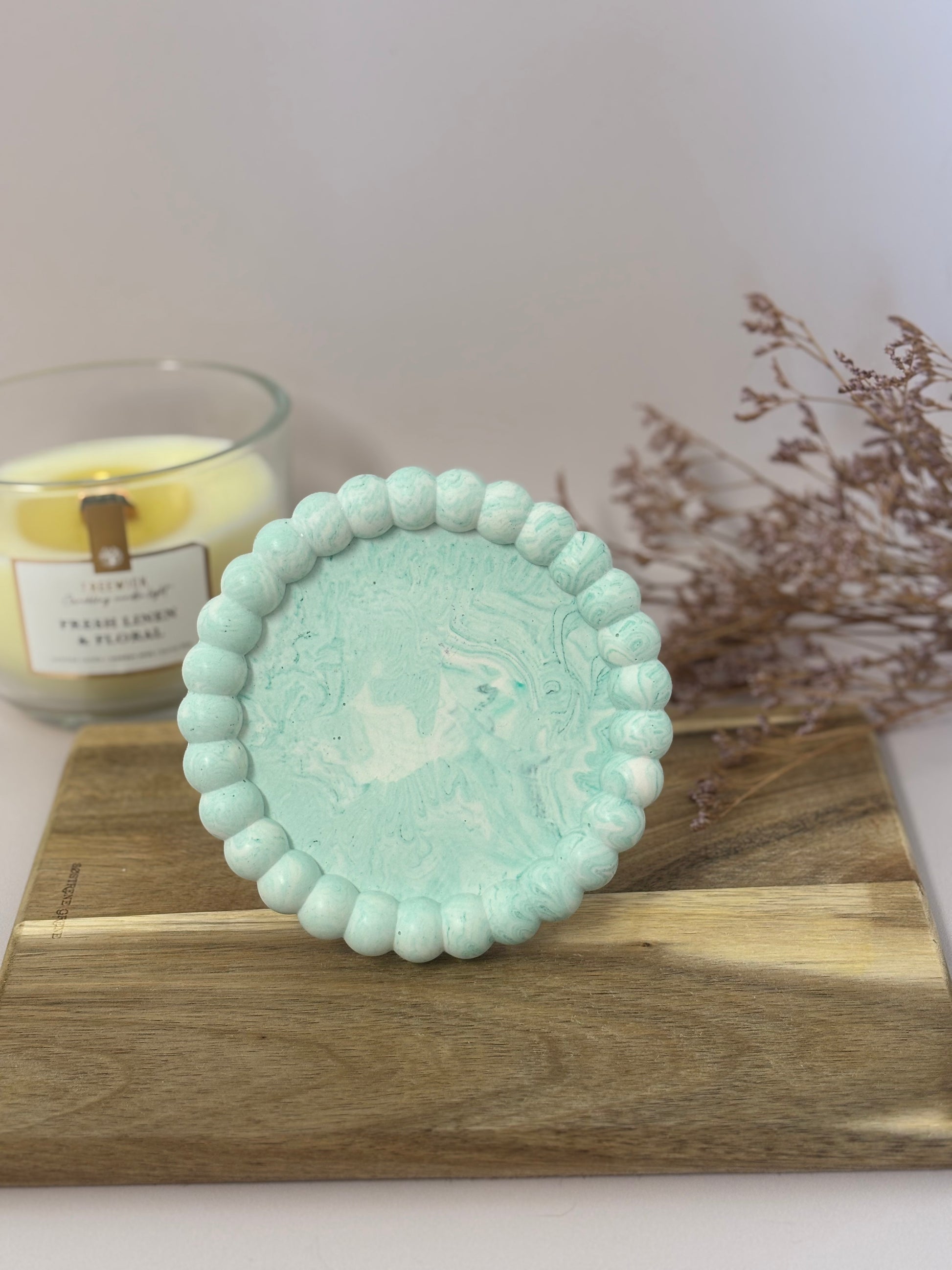 Ajoutez une touche de douceur et de modernité à votre intérieur avec ce plateau entouré de bulles, entièrement conçu à la main en jesmonite. Son design unique en fait une pièce décorative à part entière, tout en étant pratique pour organiser vos petits objets du quotidien.
